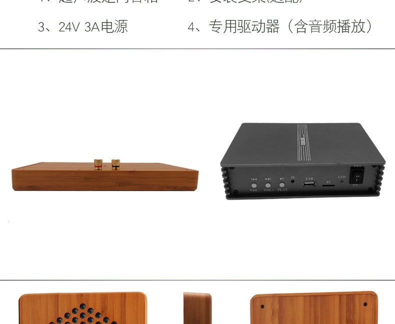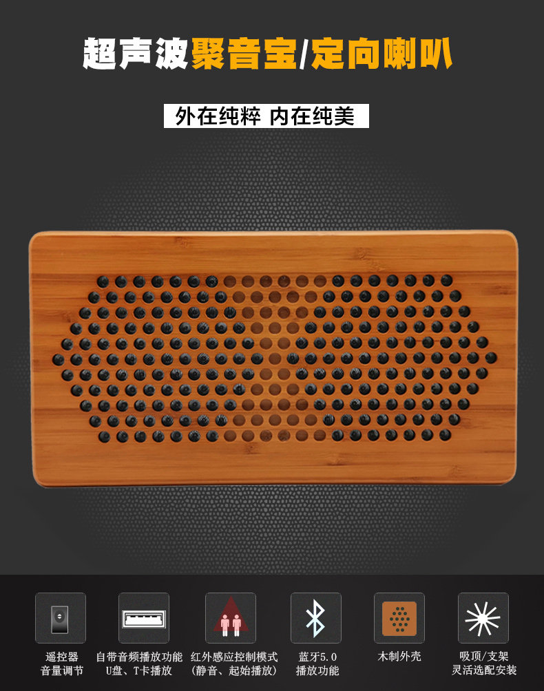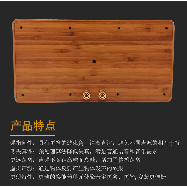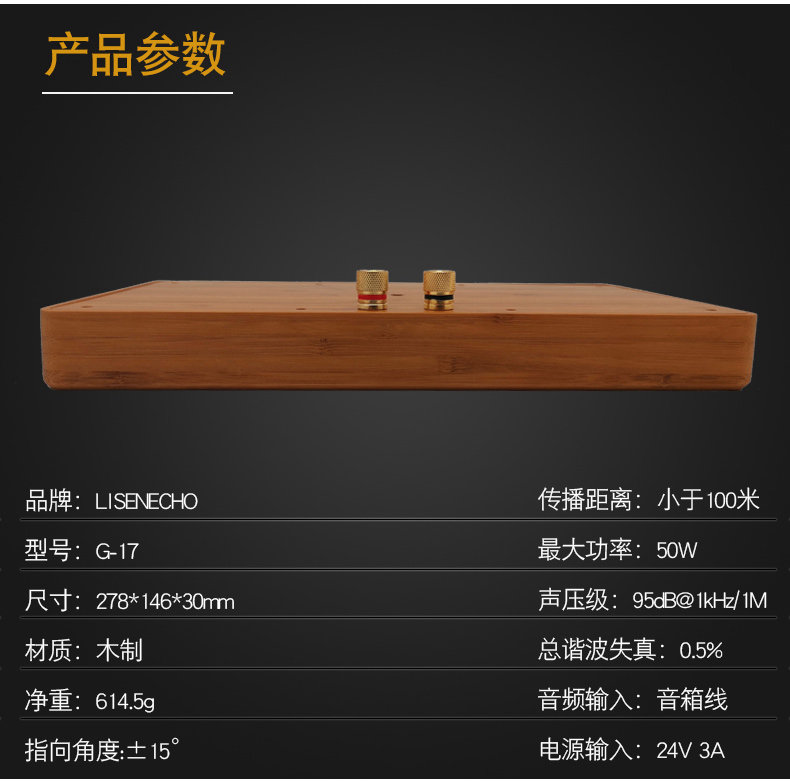 型号:G-17 尺寸:278*146*30mm 外壳:木制外壳 颜色:黑色/木原色 指向性角度:±15° 频率范围:400Hz-10kHz 最大功率:50W 声压级:95dB@1kHz/1M 电源输入:24V 3A 总谐波失真:0.5% 蓝牙 5.0 输入功能 U 盘播放功能,3.5 音频输入 应用场景:室内展厅、博物馆、科技馆等