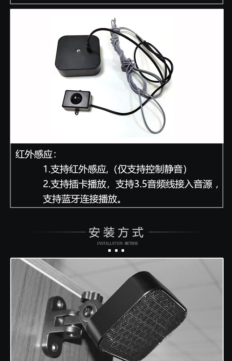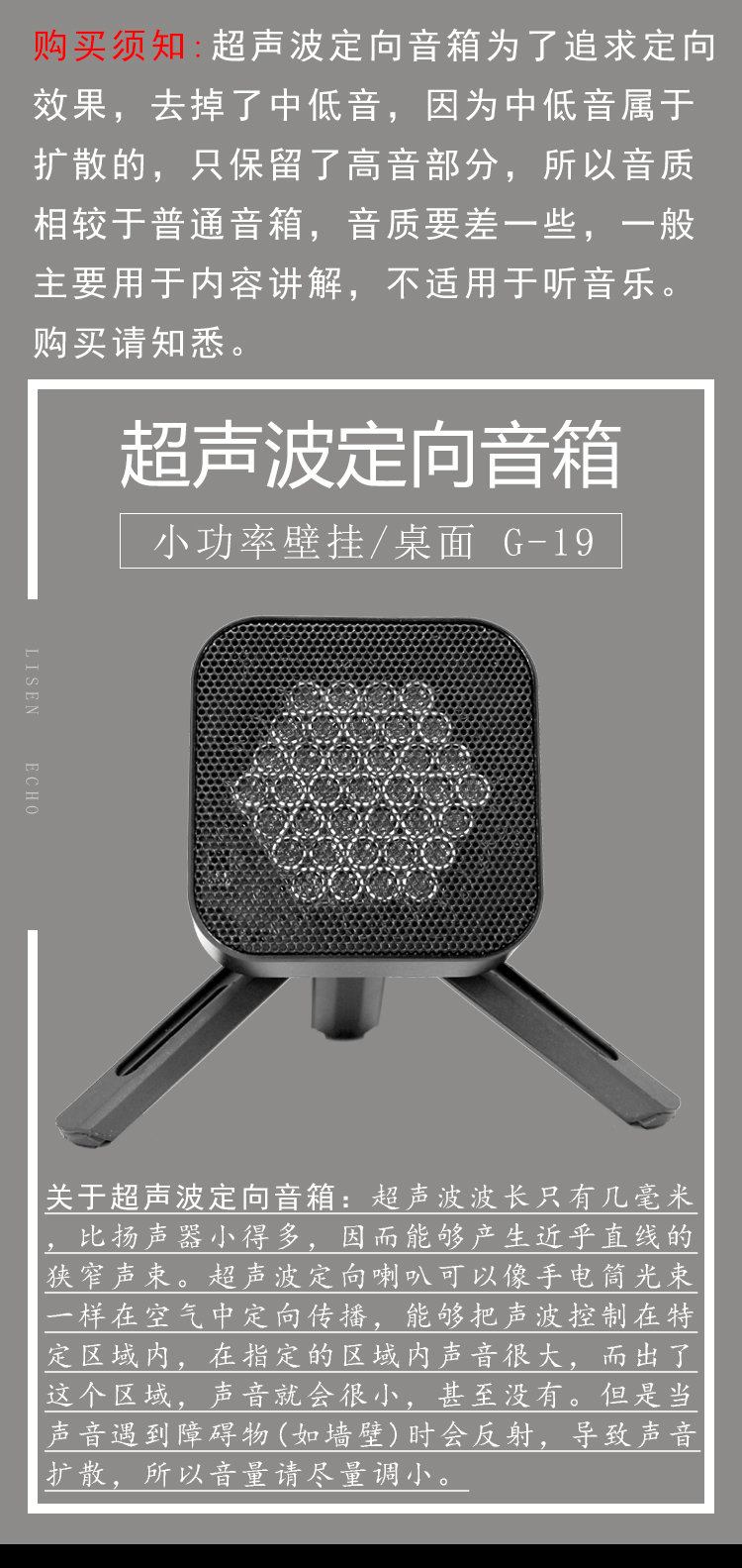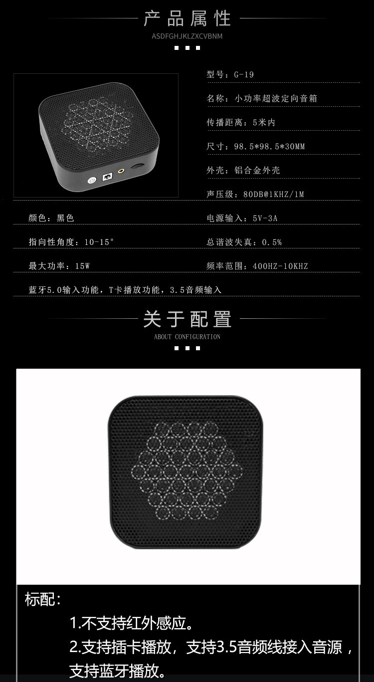 型号:G-19 功能: 指向性强,可传达 5 米内 尺寸:98.5*98.5*30mm 外壳:铝合金外壳 颜色:黑色 指向性角度:10-15° 频率范围:400Hz-10kHz 最大功率:15W 声压级:80dB@1kHz/1M 电源输入:5V -3A 总谐波失真:0.5% 音频输入:蓝牙 5.0 输入功能 T 卡播放功能,3.5 音频输入 应用场景:展馆、消费电子场景