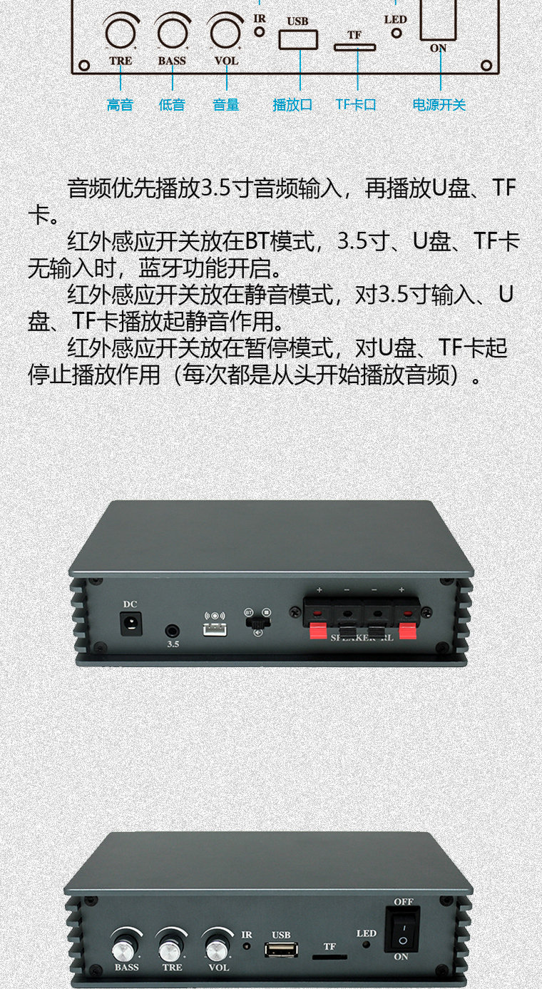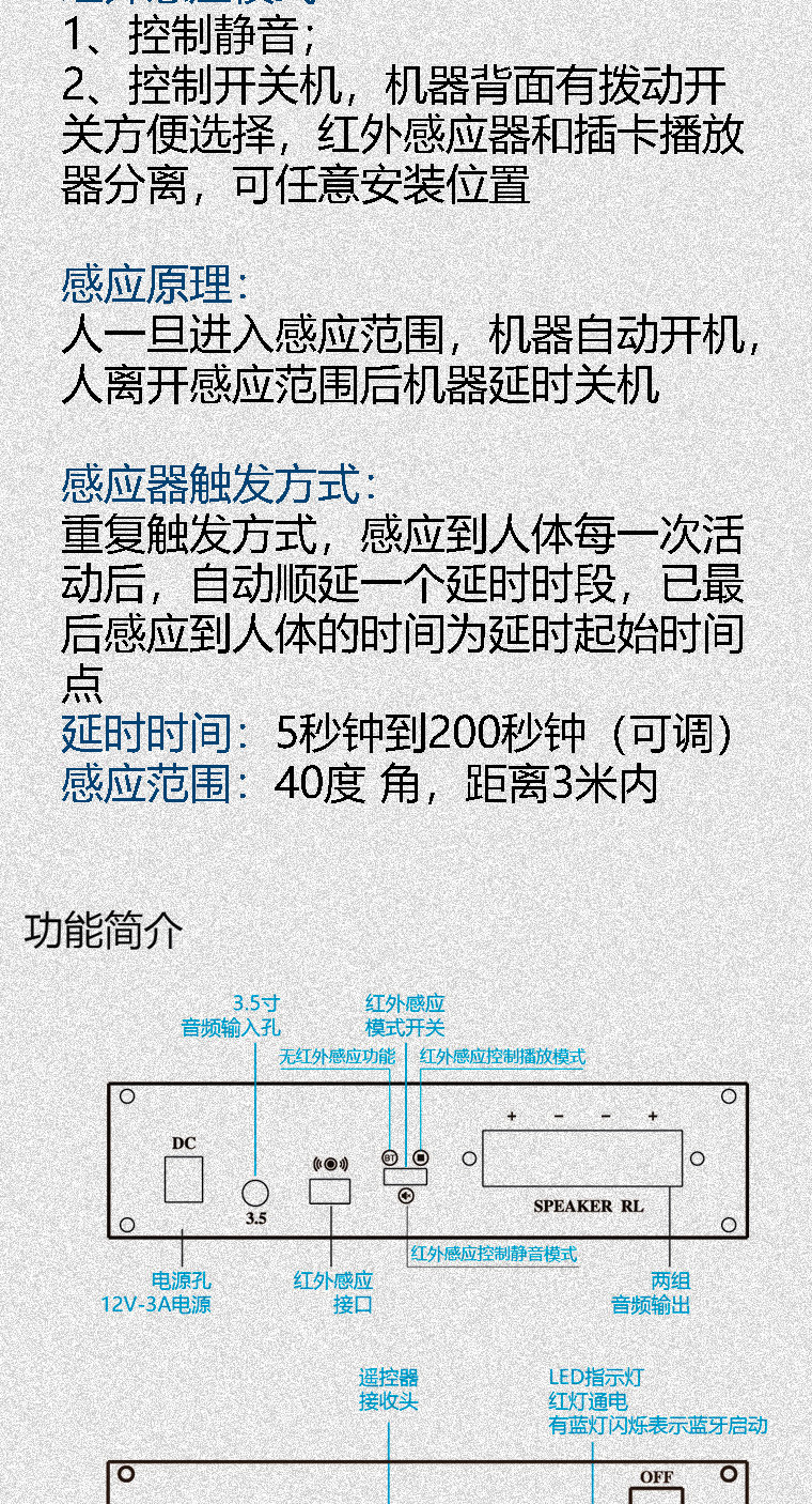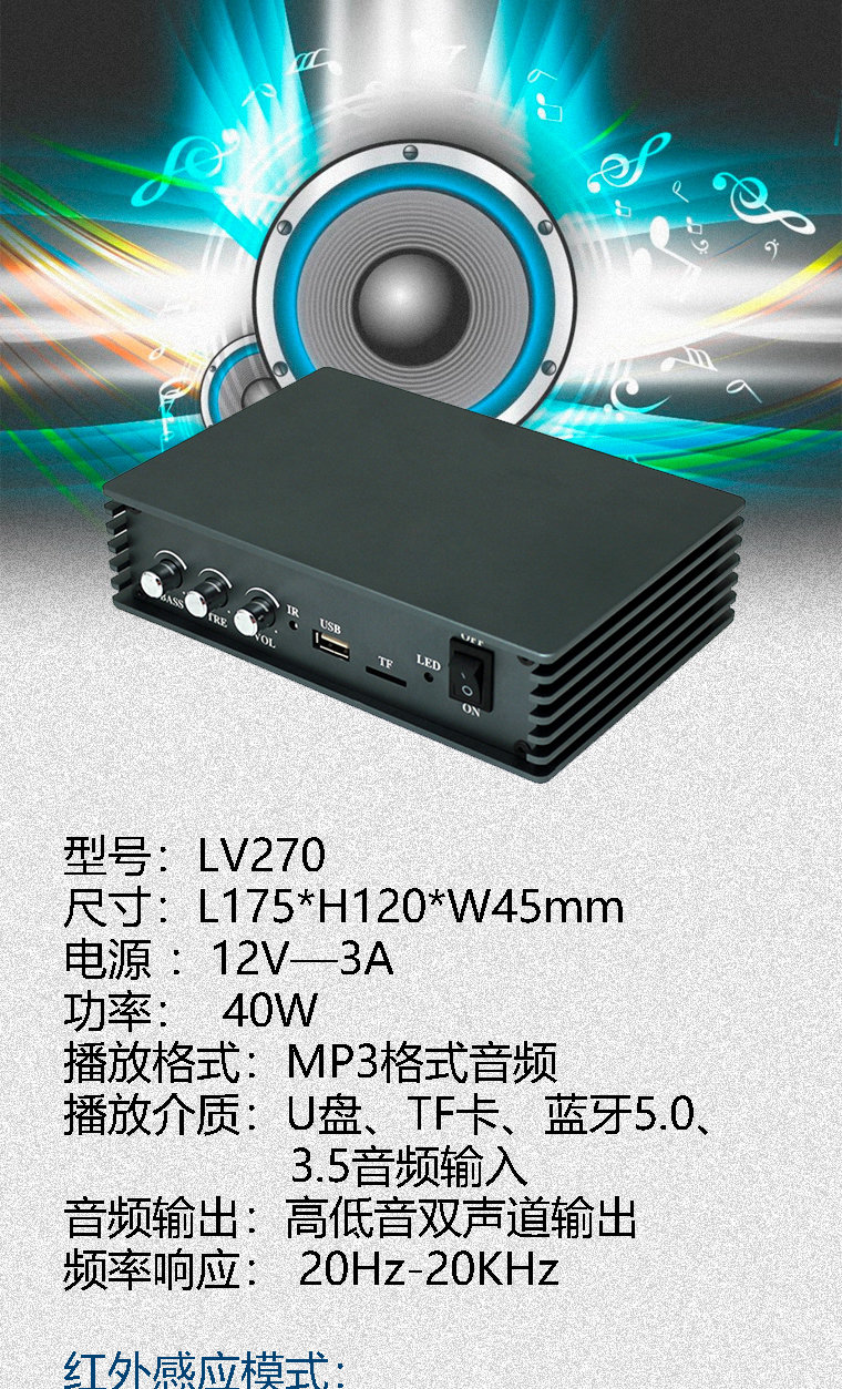 型号:LV270 尺寸:L175*H120*W45mm 电源 :12V-3A 功率: 40W 播放格式:MP3 格式音频 播放介质:U 盘、TF 卡、蓝牙 5.0、3.5 音频输入 音频输出:高低音双声道输出 频率响应: 20Hz-20KHz 延时时间:8 秒钟到 200 秒钟(可调) 感应范围:40 度 角,距离 3 米内 实现感应到人来开始播放,人离开后延时播放8 秒钟到 200 秒钟(可调)
