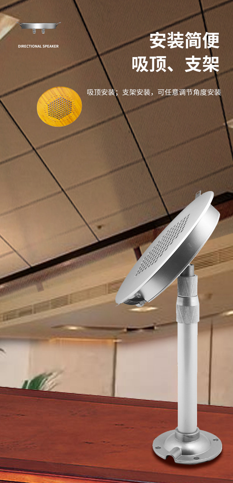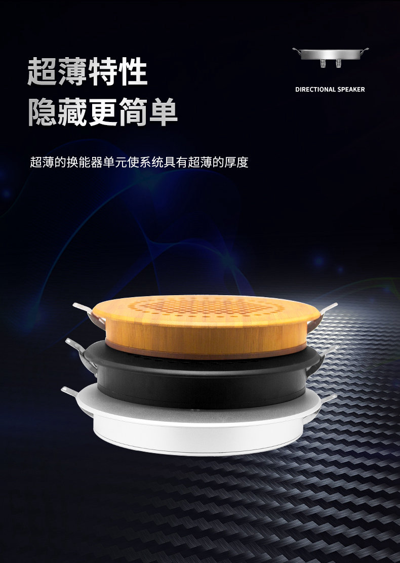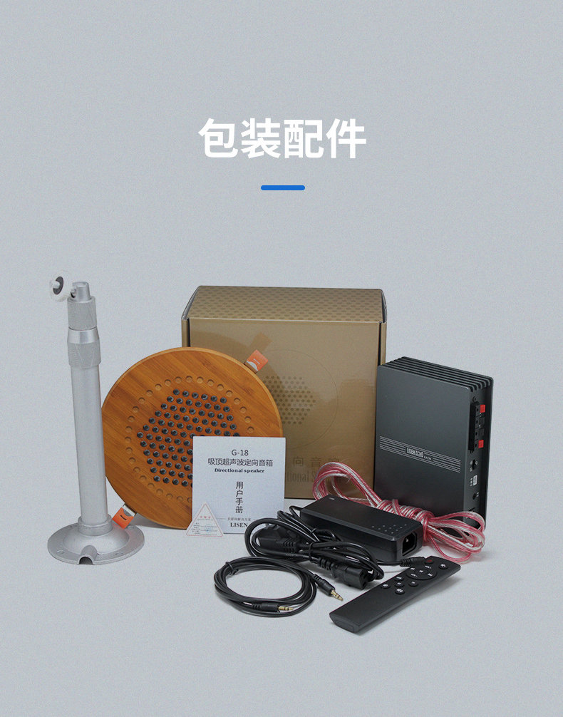 型号:G-18 尺寸:Ф200*30mm 开孔尺寸:180-190mm 外壳:全铝合金外壳或木质外壳 颜色:黑色/银色/木原色 指向性角度:10-15° 频率范围:400Hz-10kHz 最大功率:25W 声压级:85dB@1kHz/1M 电源输入:15-24V 3A 总谐波失真:0.5% 蓝牙 5.0 输入功能 U 盘播放功能,3.5 音频输入 应用场景:室内展厅、博物馆、科技馆等